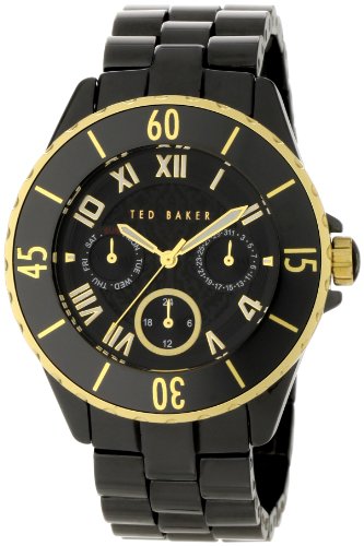 This custom Ted Baker of London "no ordinary designer watch" features: a japanese analog 3-hand multi-function movement with date, a black ceramic stainless steel case and stainless steel caseback, a solid black ceramic link bracelet, black dial with gold accents and a limited lifetime warranty.